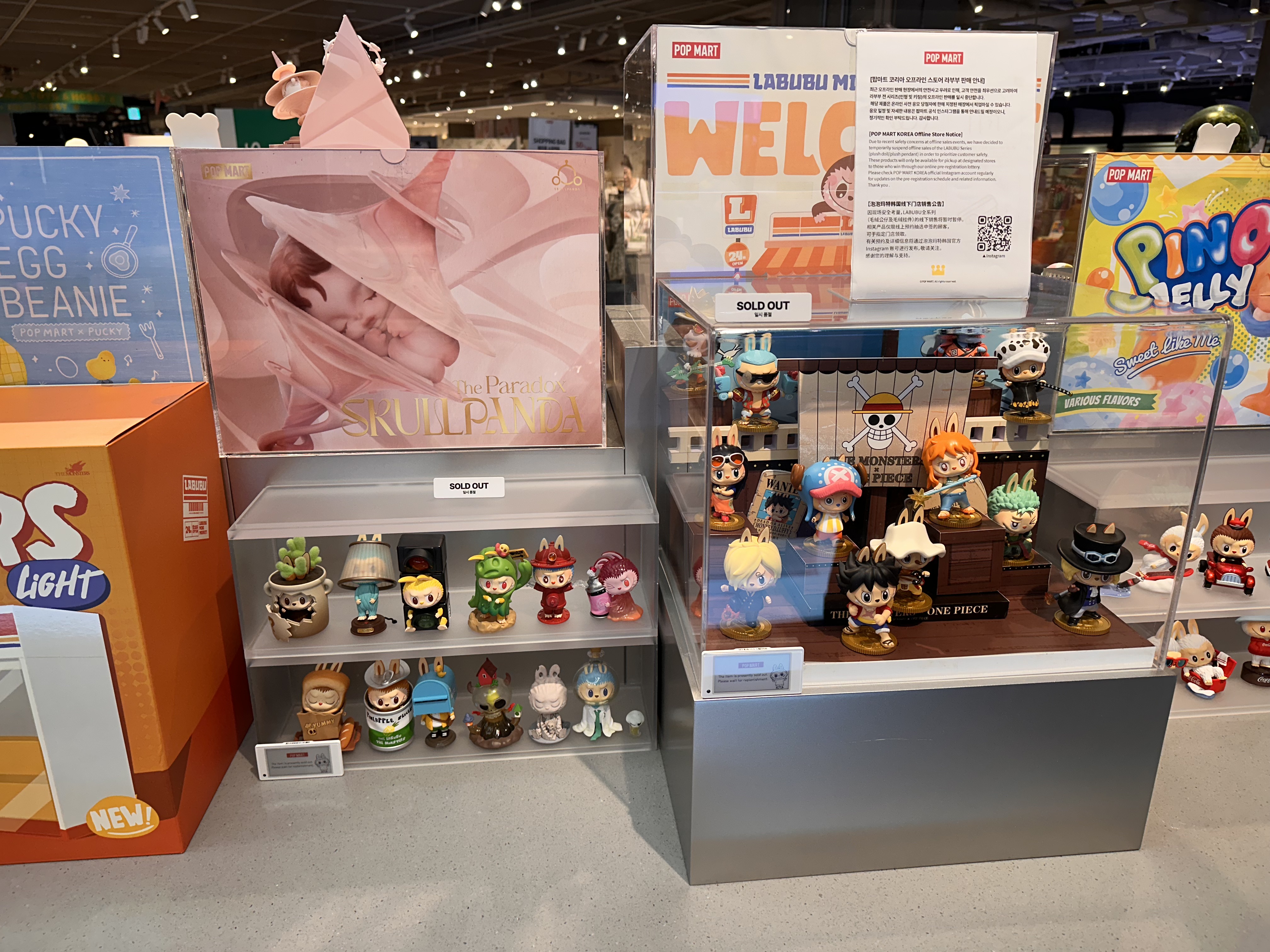 매장 안쪽에는 키링, 노트, 인형 등 피규어 외에도 아기자기한 굿즈가 가득해요. 라부부 인형, 몰리 키링, 디무 노트 등… 피규어에 관심 없는 분도 그냥 지나치기 힘들만한 매력이 있답니다.