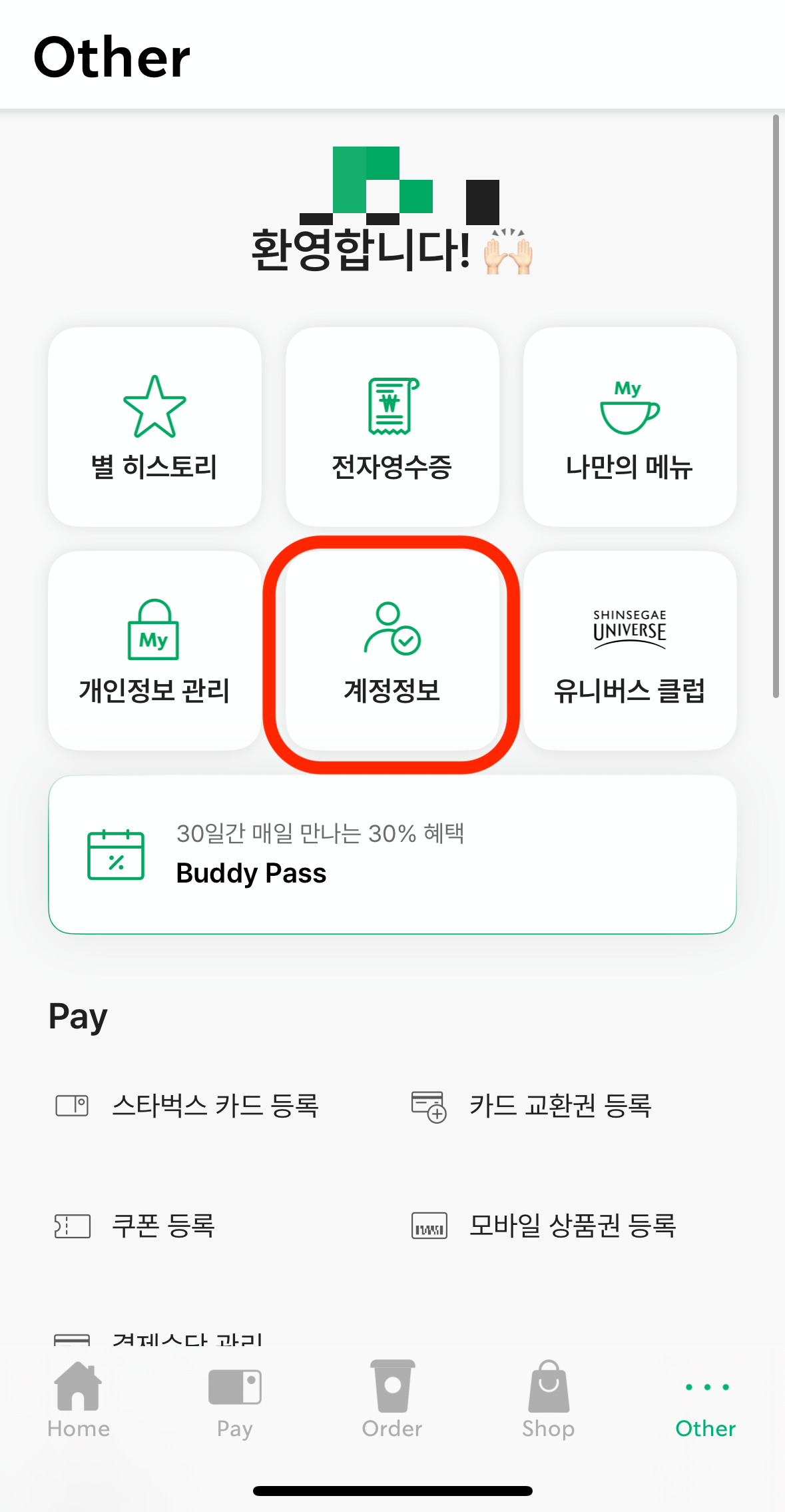 스타벅스 앱 → other → 계정정보 → ‘개인컵 리워드 설정’ ON