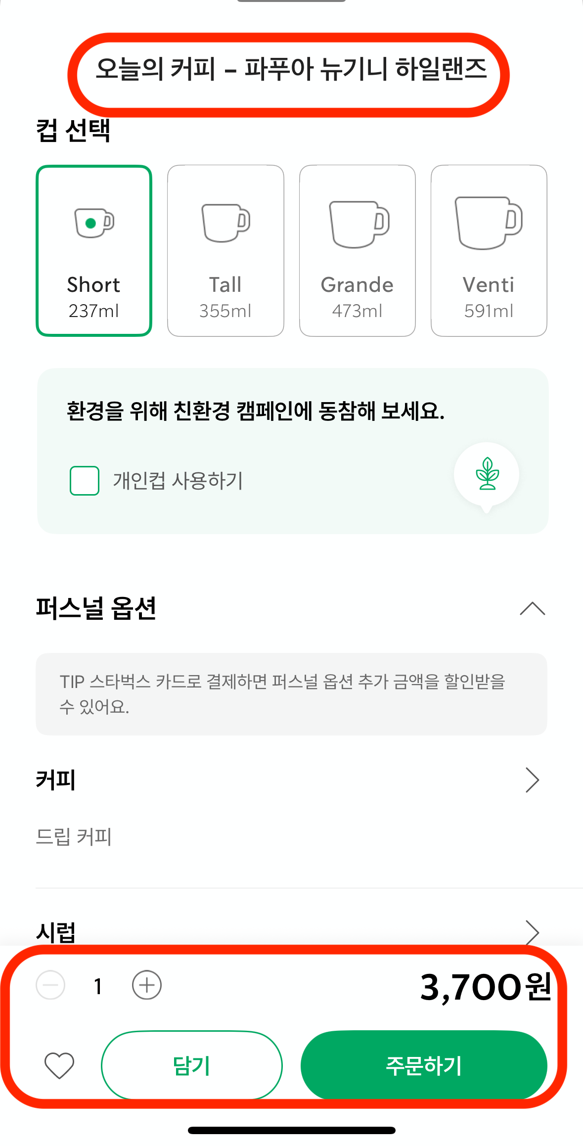 ☕ 가장 저렴한 적립 음료 → 오늘의 커피 숏 (3,700원)